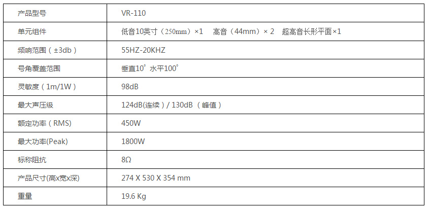 VR110全頻箱配置的是1個10寸紙盆釹磁低音揚(yáng)聲器和2個1寸高音驅(qū)動器。裝于10寸箱體前部的壓縮腔相位塞(compression chamber phase plug) 防止低頻段由于梳狀濾波產(chǎn)生干涉, 化了低頻指向性。結(jié)合在兩個高音驅(qū)動器和1個超高音驅(qū)動器間經(jīng)過耦合的優(yōu)化波形生成器,形成一個10°的垂直波面,生成非常厚實的低頻和明亮的高音。