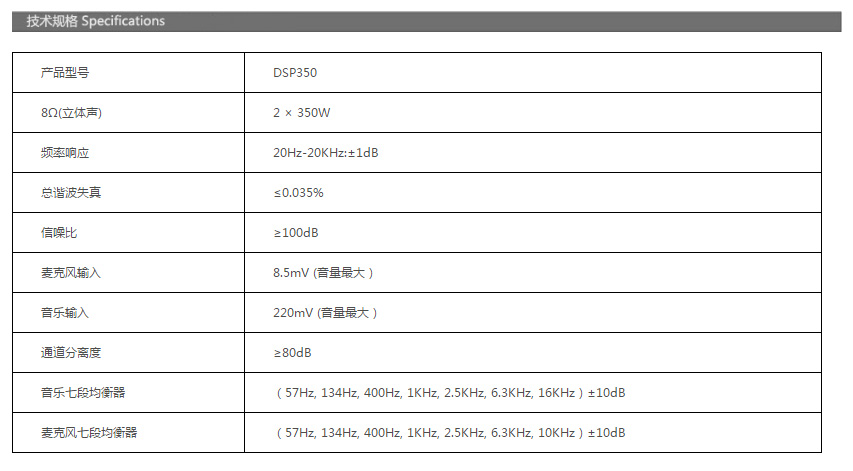 自主研發(fā)3XDSP數(shù)字處理技術(shù),可設(shè)置密碼,限定開機(jī)次數(shù);使用編碼器控制音樂與人聲總音量,可自由設(shè)定*音量;LED藍(lán)色屏顯,大旋鈕控制,盡顯高貴,操作簡單,一目了然;音樂、麥克風(fēng)音調(diào)采用7段均衡器調(diào)節(jié),低切頻點(diǎn)可調(diào);